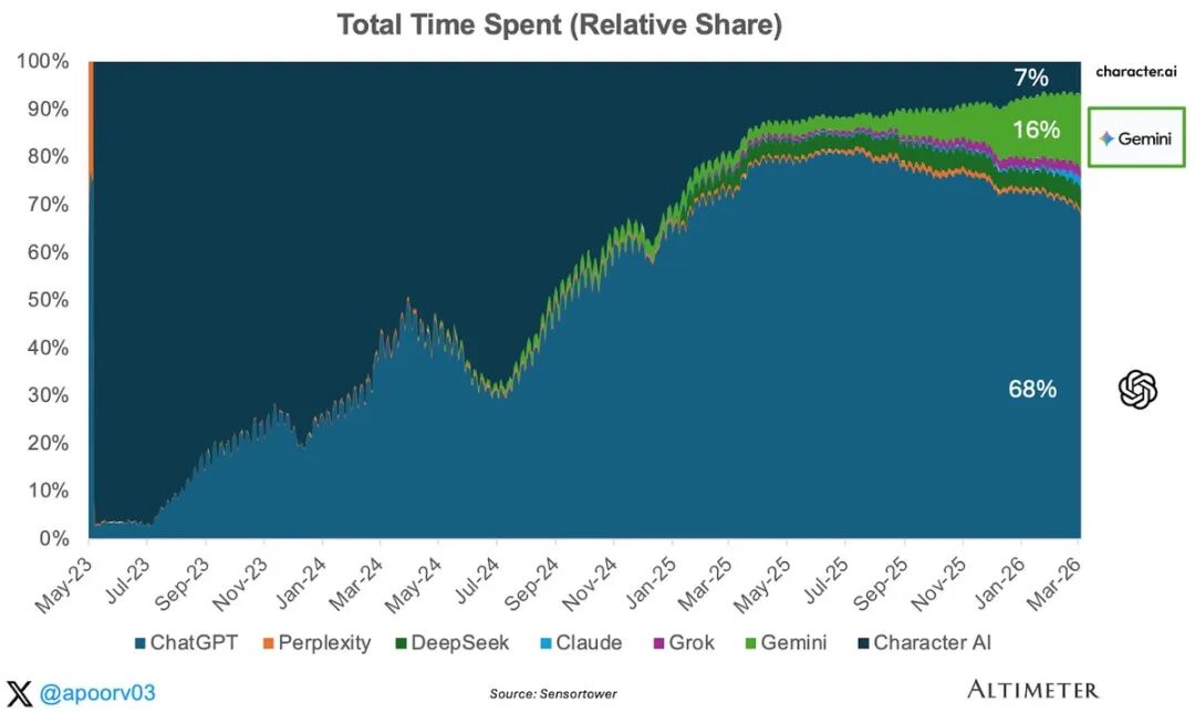 时间占比:ChatGPT 68%,Gemini 16%,Character AI 7%