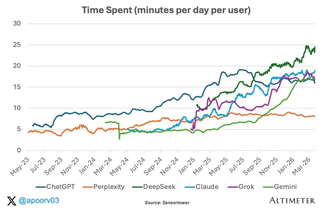 DeepSeek 的人均每日使用时间最高,约 25 分钟。ChatGPT 约 16 分钟,Claude 约 19 分钟,Gemini 约 17 分钟,Grok 约 17 分钟。Perplexity 最低,约 8 分钟——因为搜索本身就是”问完就走”的使用模式。