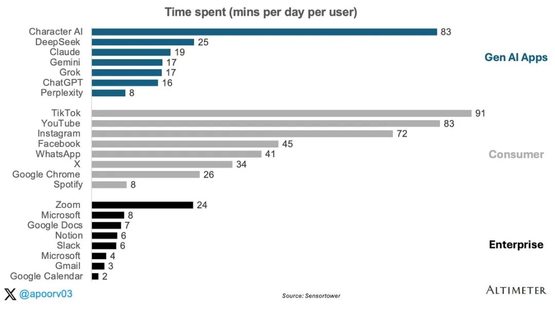 不一定。对于一些工具型应用来说,”效率高=用时短”才是好事。Perplexity 每天只花 8 分钟,但这可能恰恰说明它的搜索效率很高——问完就走,不废话。而 Character AI 每天 83 分钟,说明的是完全不同的使用场景——陪伴和情感需求。