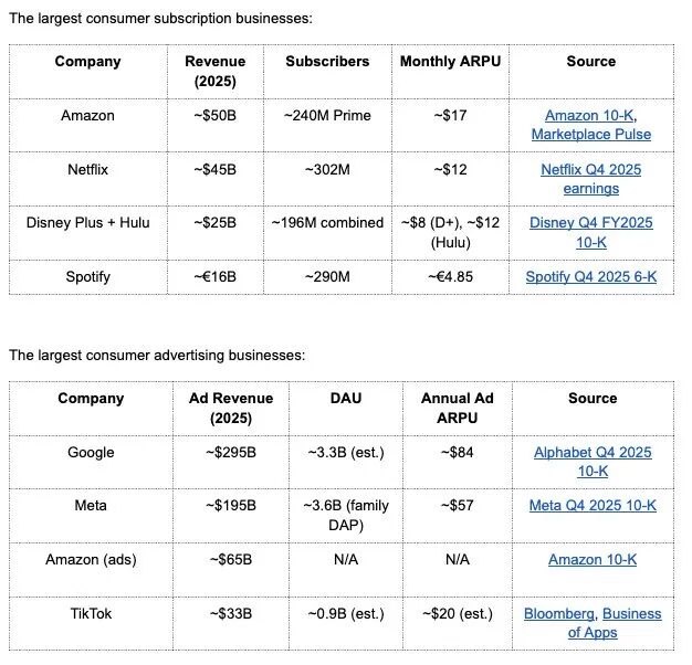 消费巨头收入对比:订阅 vs 广告模式的天花板
