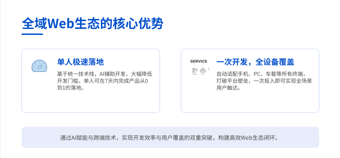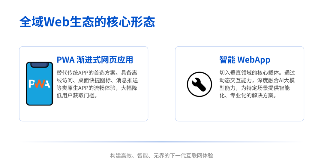 全域Web生态的核心定义:以Web标准为基础,集成AI大模型、WebGPU、WebAssembly、PWA 等技术,覆盖手机、PC、平板、车载、智能电视等全终端,支持离线使用、桌面图标、消息推送、类 APP 体验,可无缝对接 AI 智能体,实现 “Web 界面 + AI 执行” 的全新交互模式,完全自主可控、无平台束缚的轻量化产品生态。