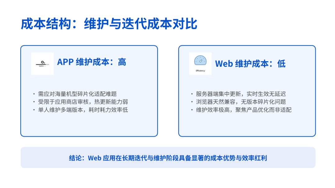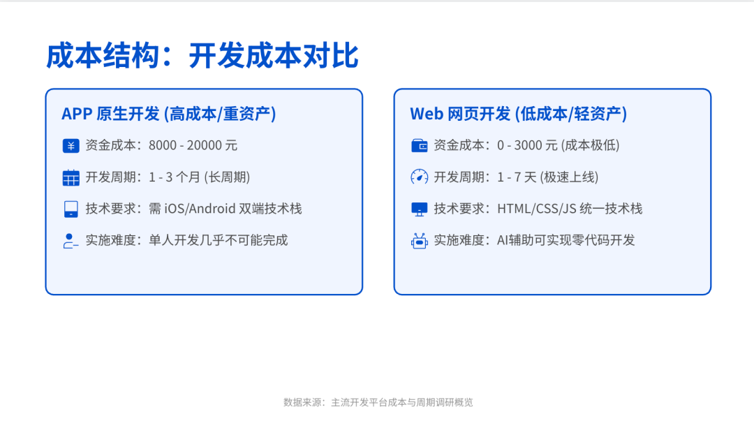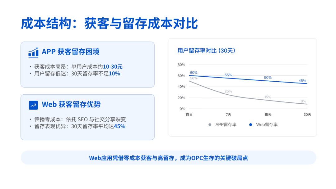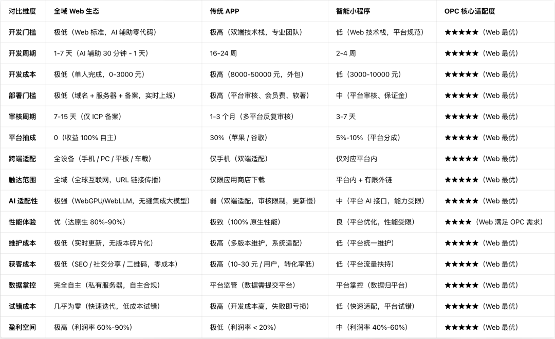 从产品经理的成本收益视角分析,APP的开发、发布、维护、获客、合规全链路成本,对OPC而言是 “不可承受之重”,而Web的成本结构与OPC完美匹配,形成 “APP 必死、Web 必兴” 的核心逻辑。