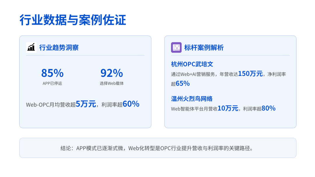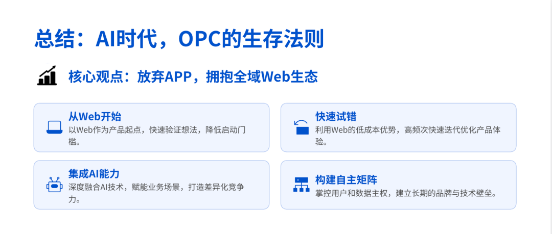 对OPC而言,“AI时代APP已死” 不是行业趋势,而是必须遵守的生存铁律:APP的功能价值被AI智能体全面替代,成本结构与OPC完全冲突,市场数据全面溃败,成功案例为零;而全域Web生态,是唯一满足 OPC“单人作战、低成本、快速盈利、自主可控、AI 原生” 核心需求的产品方向。