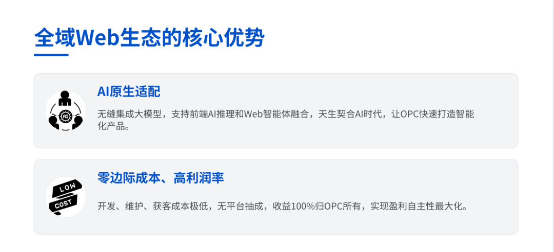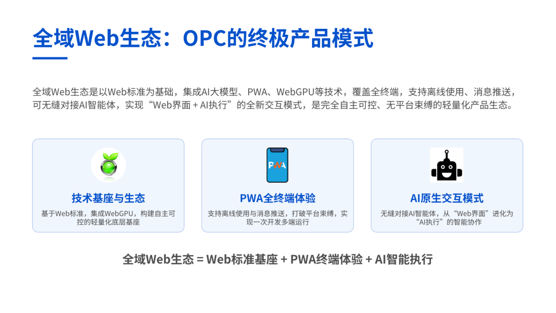 全域Web生态是AI原生应用的最佳载体,对OPC而言有三大核心优势: