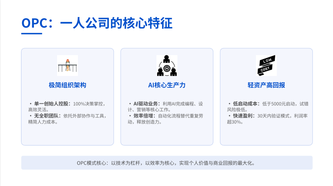 作为从业十年的产品经理,我见过无数创业团队从三人小作坊到百人公司的膨胀与崩塌。今天,我观察到一种全新的组织形态正在AI时代快速崛起——OPC(One Person Company,一人公司)。