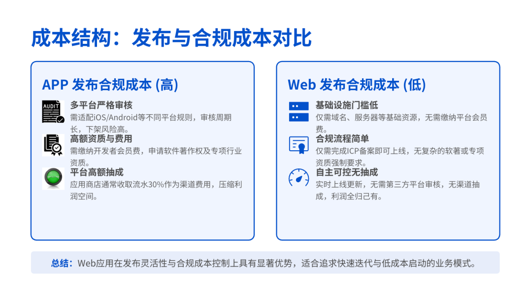 - Web 发布合规成本:仅需三步——注册域名(每年50-100元)、租赁服务器(低配每月30-50 元)、ICP 备案(7-15 天,免费),备案完成后实时上线,无平台审核、无渠道抽成、无资质门槛。功能更新可实时生效,无需等待审核,OPC可随时调整产品、响应市场,完全掌控产品生命周期,合规成本仅为 APP 的 1/10。