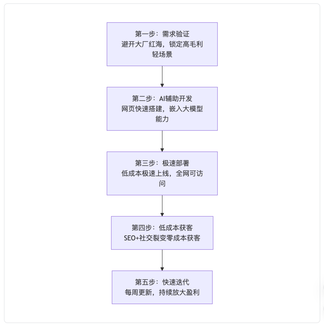 对 OPC 而言,落地全域 Web 生态无需复杂准备,遵循 “需求验证→AI辅助开发→极速部署→低成本获客→快速迭代” 的 5 步路径,30 天内即可实现产品落地与盈利。
