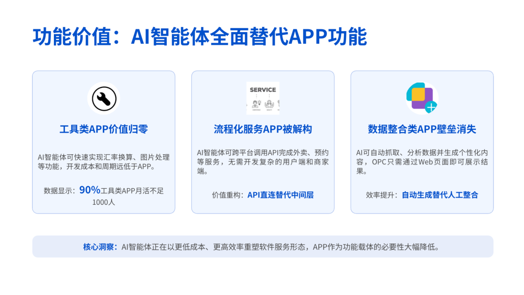 传统 APP对OPC的核心价值是 “承载单一或流程化功能、触达移动用户”,但AI智能体以 “自然语言交互、跨平台整合、自主执行任务” 的能力,实现对APP功能的 1:1 替代,且效率提升10倍以上,让 OPC无需开发APP即可实现所有功能价值。