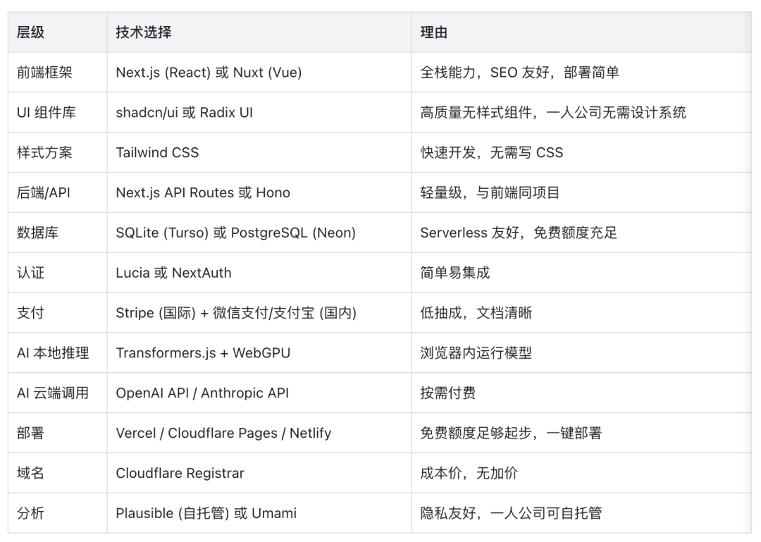 为了让本文更具实操性,我整理了一套适合一人公司的现代Web技术栈。
