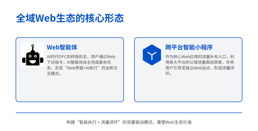 - Web智能体融合:Web应用可作为AI智能体的交互界面,用户通过Web下达指令,AI智能体自主完成跨平台任务、全域数据整合、流程化服务执行,实现 “Web 界面+AI智能体” 的OPC终极产品模式。