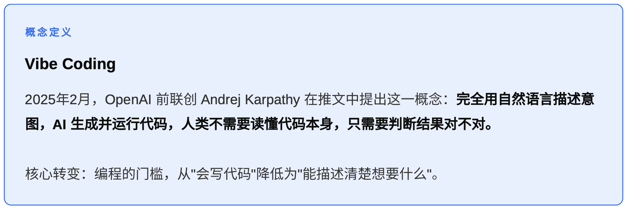 过去一年,”Vibe Coding”频繁出现在产品经理的讨论里,但很多人对它到底是什么、能做什么仍然模糊。这是理解一切的起点。