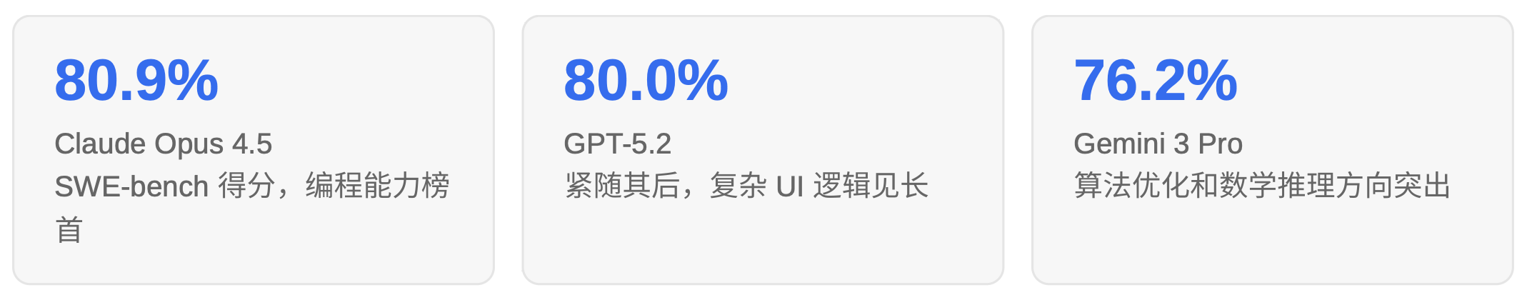 衡量 AI 编程能力的权威基准是 SWE-bench Verified——让模型解决 GitHub 真实 Issue 的能力测试,比”写出能运行的代码”要难得多。最新数据: