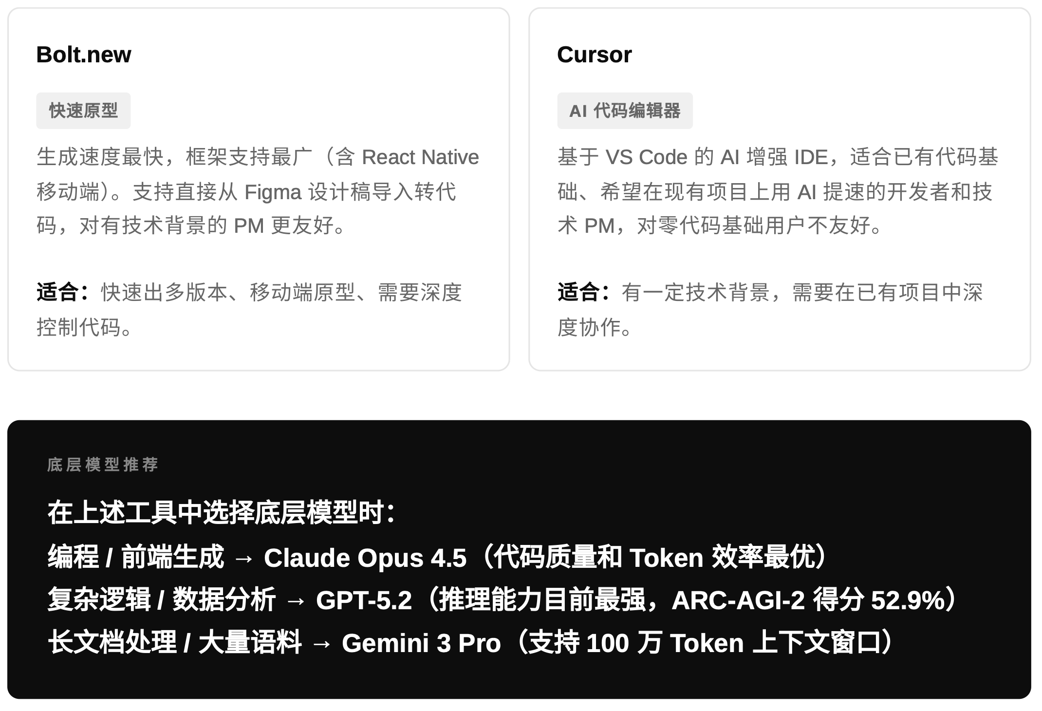 AI 能写代码是一回事,非技术人员能拿到跑起来的产品是另一回事。过去缺的不是模型能力,是环境配置、调试、部署这道门槛——这道门槛把 99% 的 PM 拦在外面。2025年起涌现的新一代工具,把这道门槛完全封装掉了,PM 不需要懂任何工程基础设施,就能直接拿到可运行的页面。