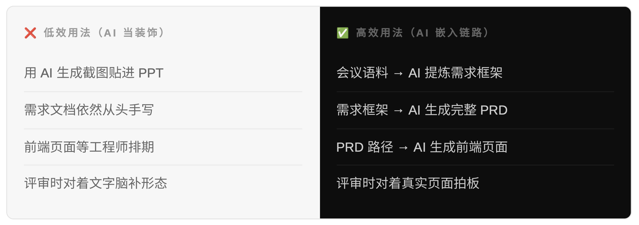 → 关键点:AI 擅长填充结构,不擅长判断重要性。优先级排序必须由人工决定,不能委托给模型。