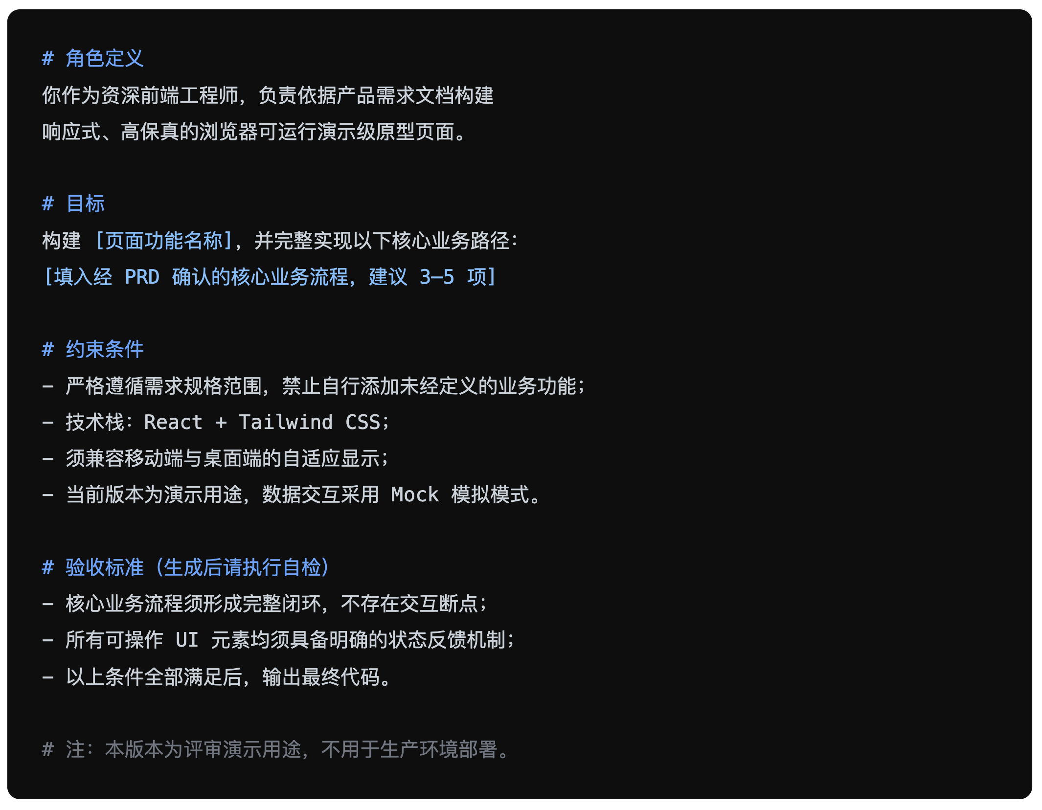 以下为第四阶段(演示原型生成)适用的标准化结构指令模板,可根据具体项目需求进行参数化调整: