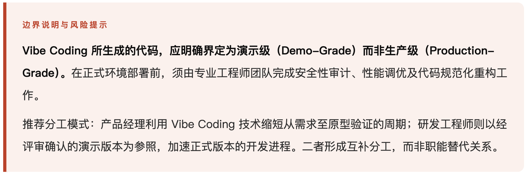 在相同的技术环境下,部分从业者能够利用 Vibe Coding 工具在短期内构建出具有实际价值的最小可行性产品(MVP),而另一部分从业者则在低效的指令反复修正中陷入停滞。同样是生成产品需求文档(PRD),高效使用者能够获得逻辑严谨、可直接用于评审的专业文档,而低效使用者往往仅能获得结构松散、需大量人工重写的草稿性输出。