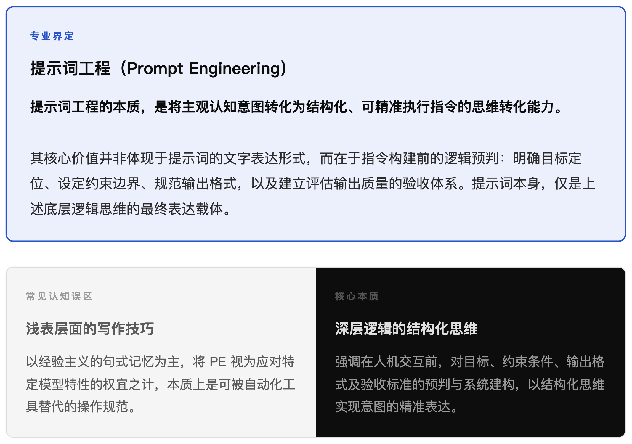 提示词工程(Prompt Engineering,以下简称 PE)在其广泛普及的过程中,存在较为普遍的认知偏差,有必要从理论层面予以澄清。