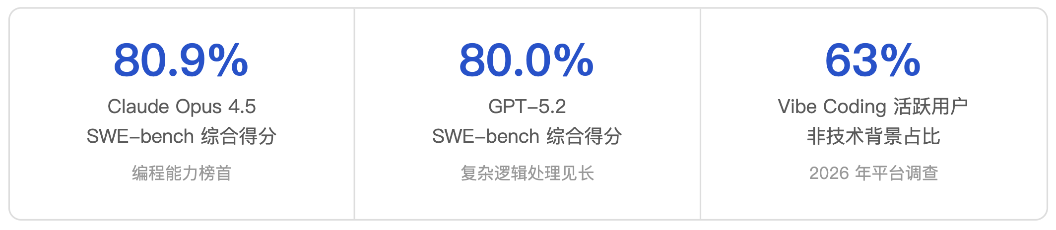 以 Vibe Coding 技术为例,当前主流大语言模型在软件工程任务上的综合表现已发生质的转变。以行业权威评测基准 SWE-bench Verified 为参照——该测试考察模型解决 GitHub 真实工程缺陷(Issue)的能力,远超简单代码片段生成的难度——最新数据如下: