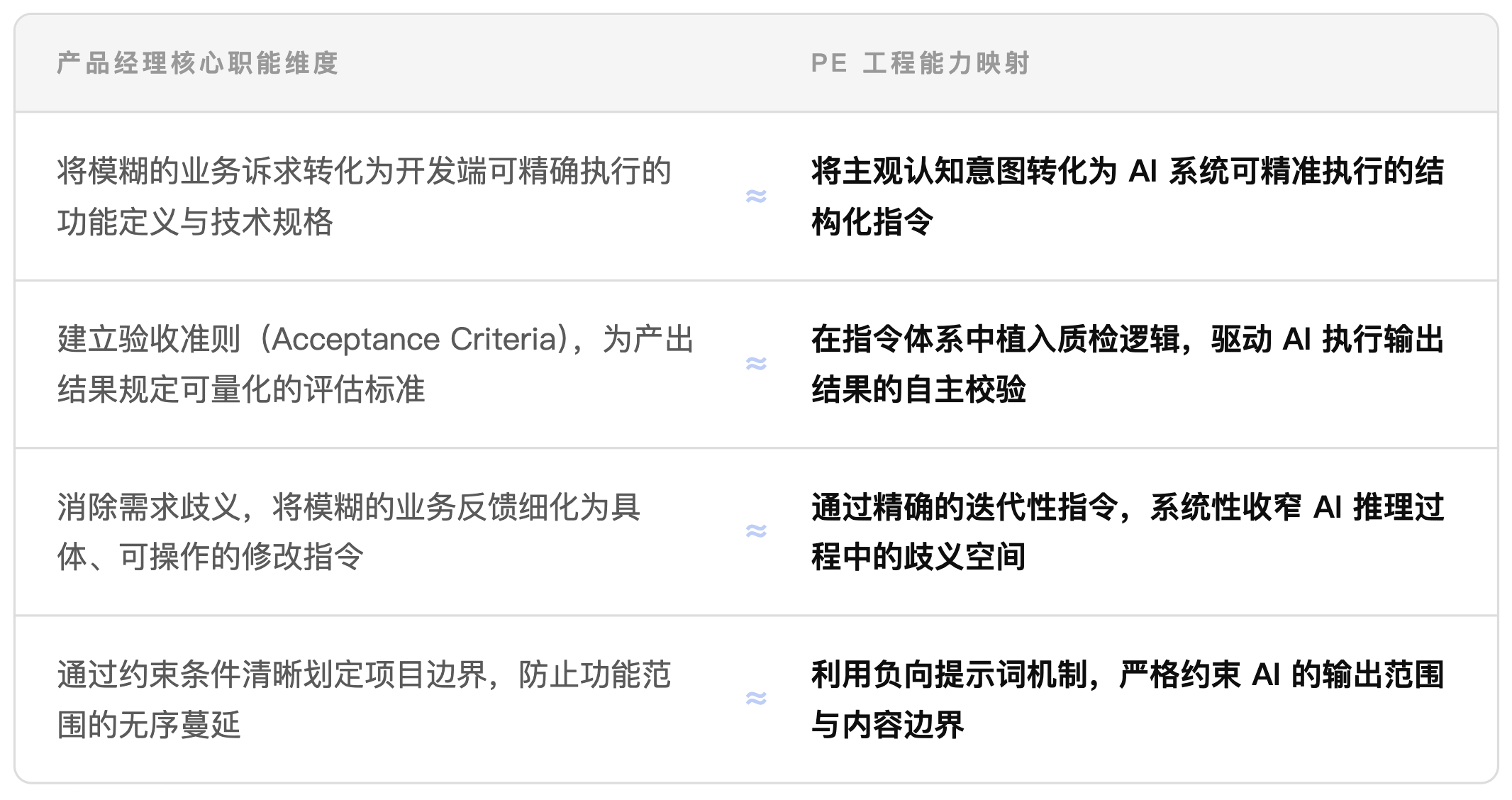 在 AI 协作的新范式下,产品经理的核心职业能力与 PE 工程之间存在高度的方法论同构性,二者在底层逻辑上高度契合: