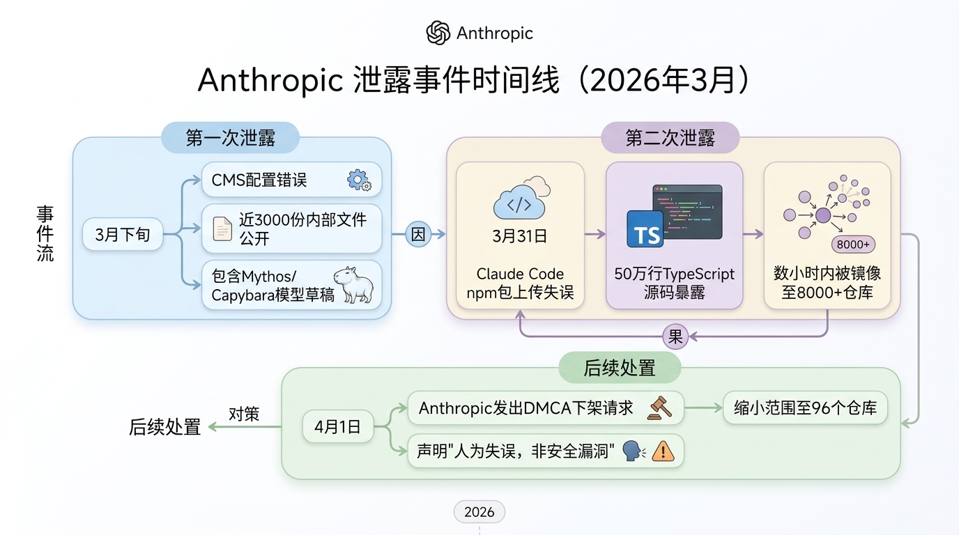 第一次:CMS配置错误,近3000份内部文件暴露在公网,其中包括一份描述下一代模型”Mythos/Capybara”的草稿博文。第二次:Claude Code在发布npm包时,意外把整个TypeScript源码——约50万行、近1900个文件——一起打包上传了。几小时内,代码被镜像到8000多个GitHub仓库,Anthropic随即发出DMCA下架请求,但已经晚了。