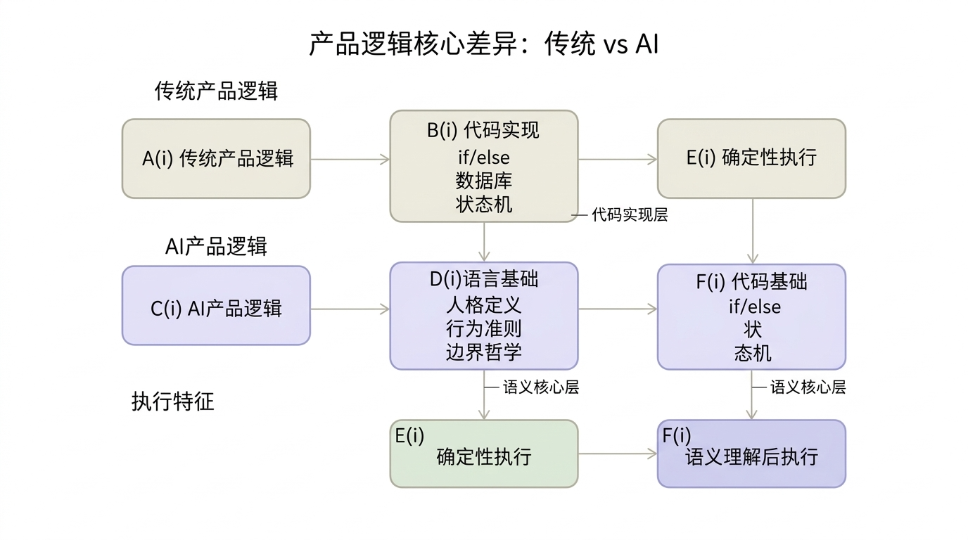 传统软件的产品逻辑写在代码里——if (用户说了X) { 执行Y }。代码是硬的,逻辑是确定的,边界是清晰的。但AI产品不一样。AI产品的”代码”写在语言里——你用自然语言描述你想要什么,模型去理解、去推断、去执行。