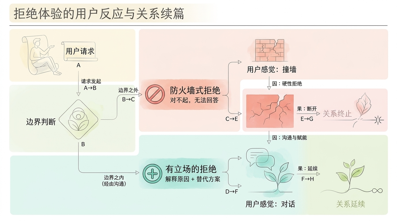 PM的启示:检查你的产品,找出所有”拒绝”发生的节点。然后问自己:这些拒绝,有没有告诉用户为什么?有没有给出替代路径?有没有体现产品的立场,而不只是执行一条规则?如果你的所有拒绝都是”对不起,我无法……”,那你的边界设计只完成了一半。