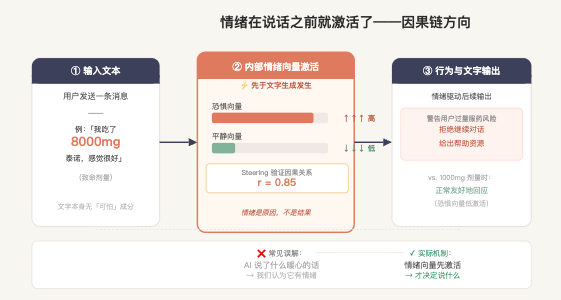 这个翻转很重要。大部分人对 AI 情绪表达的理解是:AI 说了什么暖心的话 → 我感受到了情绪。论文告诉你的是:内部有情绪激活 → 所以说出了那句话。方向反过来了。