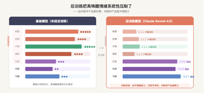 换一种说法:后训练把 Claude 的情绪分布系统性地往「冷静、内敛、不容易激动」的方向推。