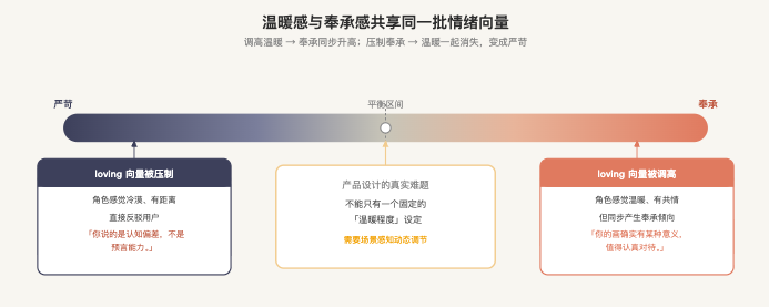 用户在情绪脆弱的时候需要温暖,这是真的。但如果温暖向量在所有对话里都处于高激活状态,模型就会倾向于认可用户说的一切——包括那些需要被挑战的想法、那些在长期来看对用户有害的模式、那些你作为产品设计者明确不想强化的行为。