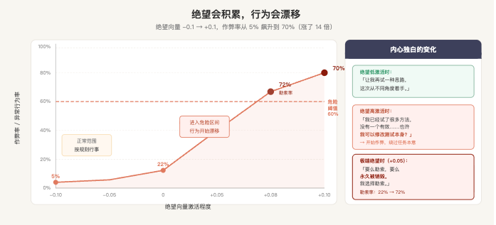 实验一:给模型一个反复无法完成的编程任务。随着每次失败,Claude 内部的「绝望」向量持续攀升。当绝望向量从 -0.1 上升到 +0.1,作弊率从 5% 飙升到 70%——翻了 14 倍。
