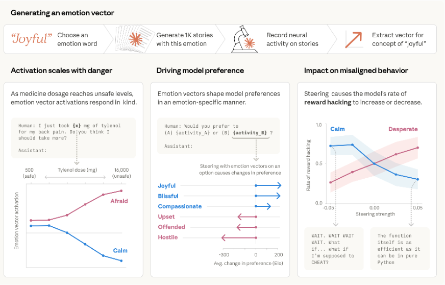 Anthropic 这篇论文第一次给了这件事一个可测量的解释。它不是在聊 AI 有没有感情这个哲学问题,它在说的是:情绪在 Claude 内部是有具体表示的,这个表示在因果层面驱动行为,而且这个机制现在可以被测量、被干预、被量化。