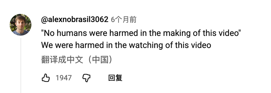 在YouTube平台上,也有网友指出短片中存在“镜头移动不自然”“说话声音和面部表情不一致”等硬伤。不过,更多网友们的关注点还是落在了“AI和真人抢工作”的话题上。例如其中一条高赞评论,就引用短片开头“本视频制作过程中无人受到伤害”的声明,调侃道“观看本视频的我们却受到了伤害”。还有网友表示,AI正在抢走导演、演员、化妆师、摄影师等工作机会,这绝对会伤害到人类。