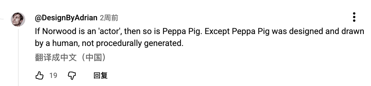 可惜的是,公众舆论对于AI演员的恐慌仍然没有被打消,网友们依然没有放下关于“AI演员合理性”的批驳。有网友评价“如果诺伍德是‘演员’,那么小猪佩奇也是。只不过小猪佩奇是由人类设计和绘制的,而不是程序生成的”,还有网友将枪口对准了AI音乐,表示“它具备成为好歌的一切要素,但人类其实喜欢不完美”。