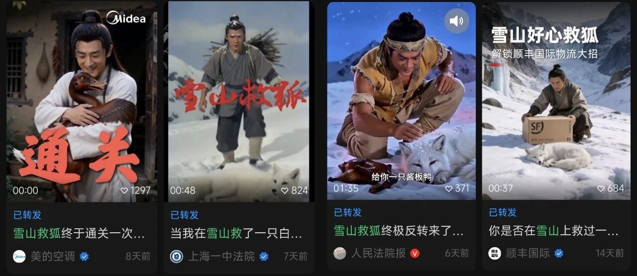 不到半个月后,“雪山救狐狸”的AI短视频刷屏全网。从普通网友到官媒、央媒、政务媒体纷纷下场,最终发展成了一场全民二创。但当所有人被“雪山救狐狸”的AI短片逗得哈哈大笑时,似乎又很少有人在意片中的角色也是AI生成的。
