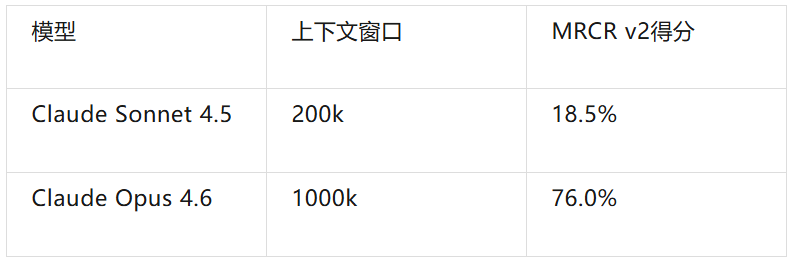 第一个维度是上下文容量。Claude Opus 4.6在MRCR v2测试(专门测试AI在海量文本中找信息的能力)中得分76%,而Sonnet 4.5只有18.5%。这76%对18.5%的差距,不是量变,是质变。它意味着Agent能否在长任务中记住早期阶段的关键信息,能否在任务推进数百步后仍然不丢失最初的目标。