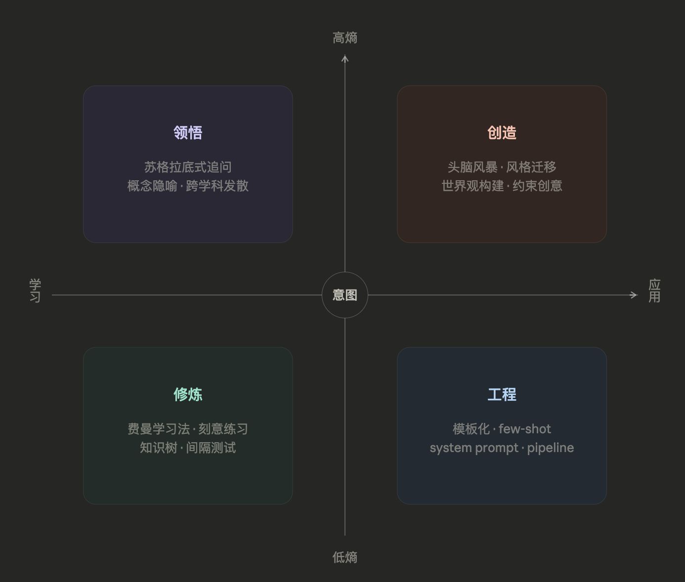 - 你可能在修炼(学习 × 低熵)中积累了足够的基础,从而有能力提出更深层的、进入领悟(学习 × 高熵)的问题 。没有扎实的基础,所谓的高熵对话往往会沦为毫无营养的闲聊。只有当你在修炼象限中,通过刻意练习掌握了某个领域的底层逻辑后,你才能敏锐地察觉到该领域的边界和矛盾,从而向 AI 提出那些真正具有颠覆性的、能够引发深度领悟的好问题。