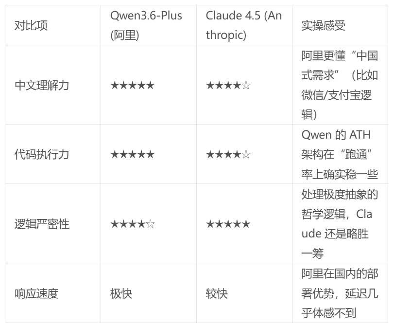 老兵直言: 以前我们总觉得国产模型是“低配版”,但 Qwen3.6-Plus 出来后,在实用性和落地效率上,它已经完全不输给硅谷那些顶流了。甚至在搞本地化业务(比如对接国内各种 API)时,Qwen 才是那个更好用的“趁手兵器”。