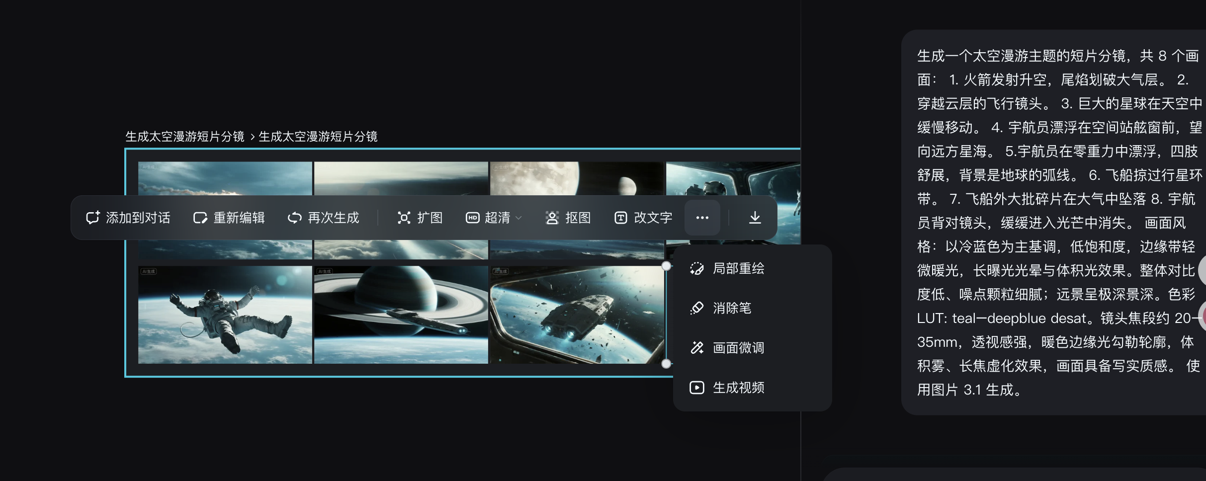 - 预测式交互,缩短路径:在用户生成一张图片后,系统会智能预测下一步动作,主动推荐“扩图”适配封面或“转视频”增加动效。这种主动推断用户意图的设计,体现了极高的人机交互水平,不断降低用户的操作与思考成本。