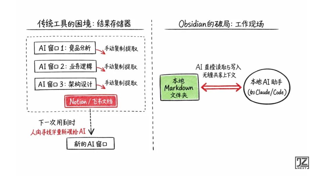 不是因为它多强,而是因为它就是一堆本地 Markdown 文件。Claude 等本地 AI 工具可以直接“读到我正在做的事情”——不是复制后的,不是整理后的,是原始上下文。