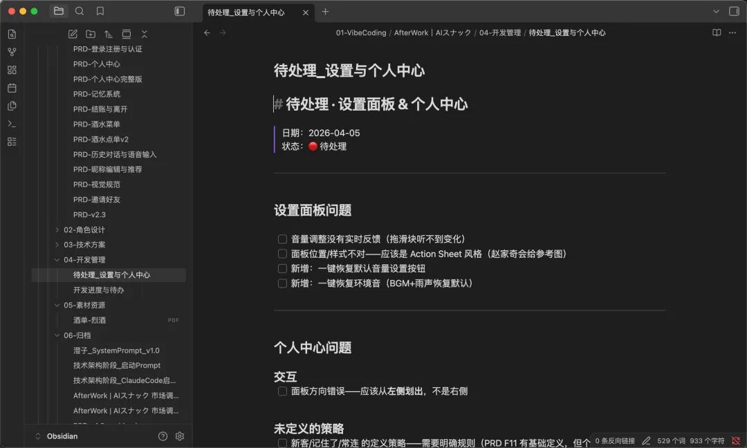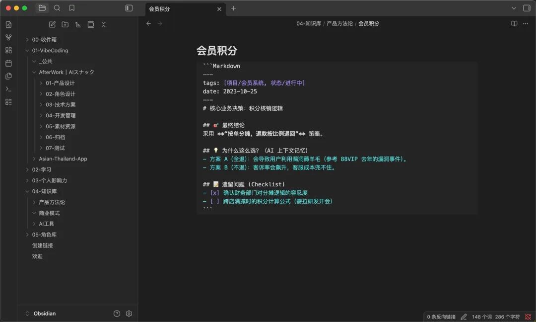 - Obsidian 负责“对内”与“底层”:它是我的个人思考中枢和 AI 协作现场。 所有复杂的预研、代码生成、逻辑拆解,都在本地 Markdown 文件夹里由我和 AI 共同完成。