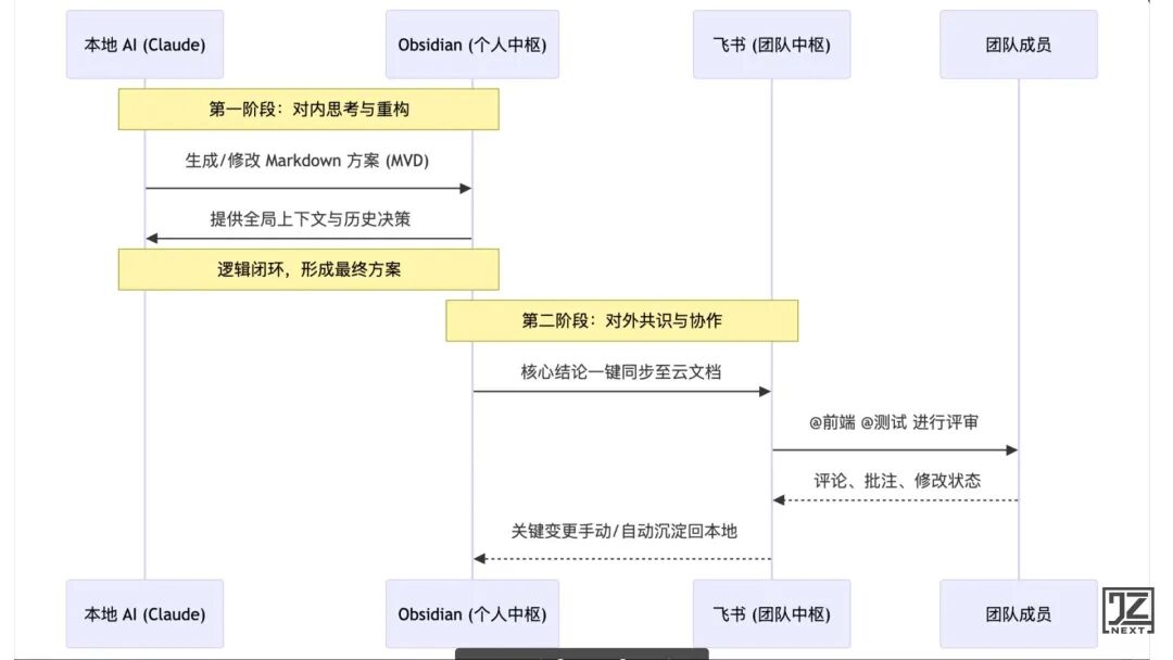 - 飞书负责“对外”与“共识”:它是团队协作中枢。 当 AI 在 Obsidian 里把一团乱麻理清,并输出结构化的 Markdown 方案后,我一键同步到飞书云文档,用于团队评审、画图对齐、@相关人跟进。