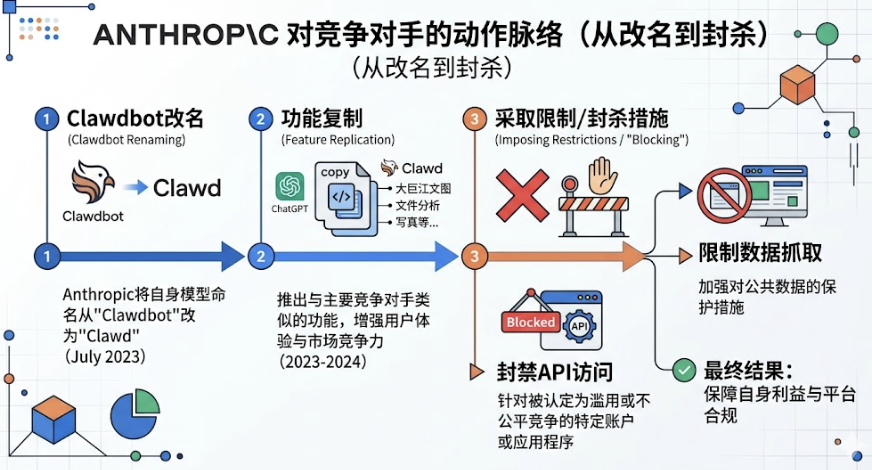 第一步:商标施压。OpenClaw最初叫”Clawdbot”,Anthropic以名称与Claude过于相似为由,要求强制改名。这是第一次明确的边界划定——我允许你存在,但你不能借我的名字生长。