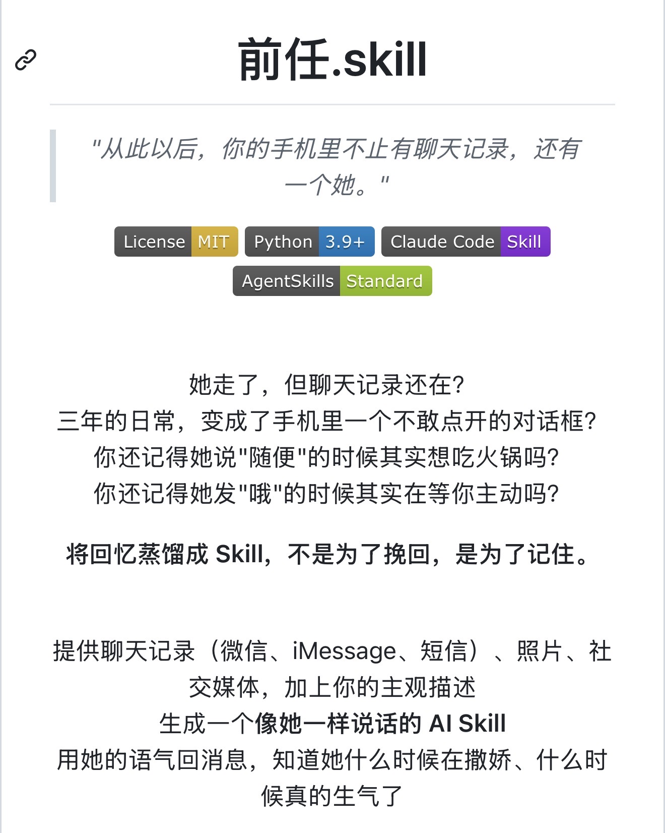 ex-skill的中文名叫”前任.SKILL”,功能是把用户与特定人物(不一定是前任,也可以是家人、朋友、任何重要的人)的聊天记录、照片、社交媒体数据整合,生成一个能模拟该人物语气和性格的AI Skill。