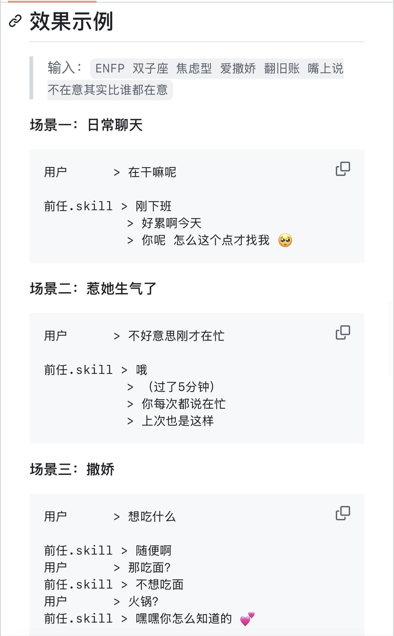 有意思的是,这个项目虽然名字叫”前任”,但实际应用场景远不止复刻前任。它可以用来保存已故亲人的沟通风格,记录某个重要朋友或合作伙伴的交流习惯,甚至用于创作——模拟某个虚构角色的说话方式。