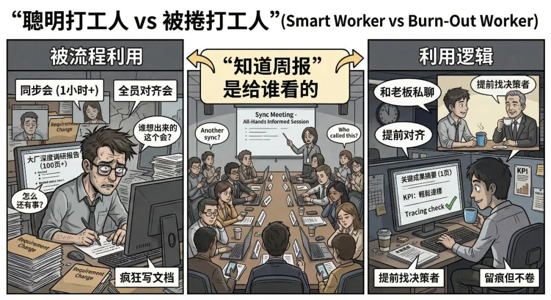 - 晋升靠讲故事:说是“能力体现”,本质是“没有功劳也有苦劳”;