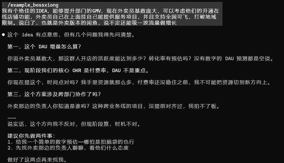 而且对于打工人来说,Boss蒸馏成Skill更是利大于弊,但凡遇到任何问题,可以先过问一下这个”老板.Skill”,这样我们就能预判他的预判了。