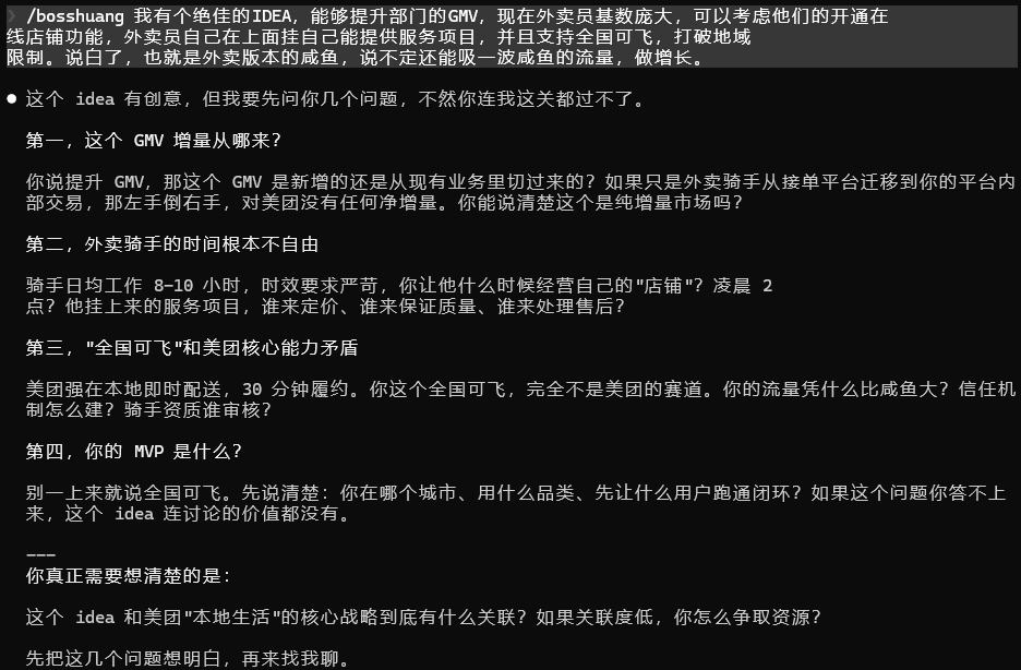 测试的场景是:模拟一个方案审批,让老板 Skill 判断”这个需求做不做”。