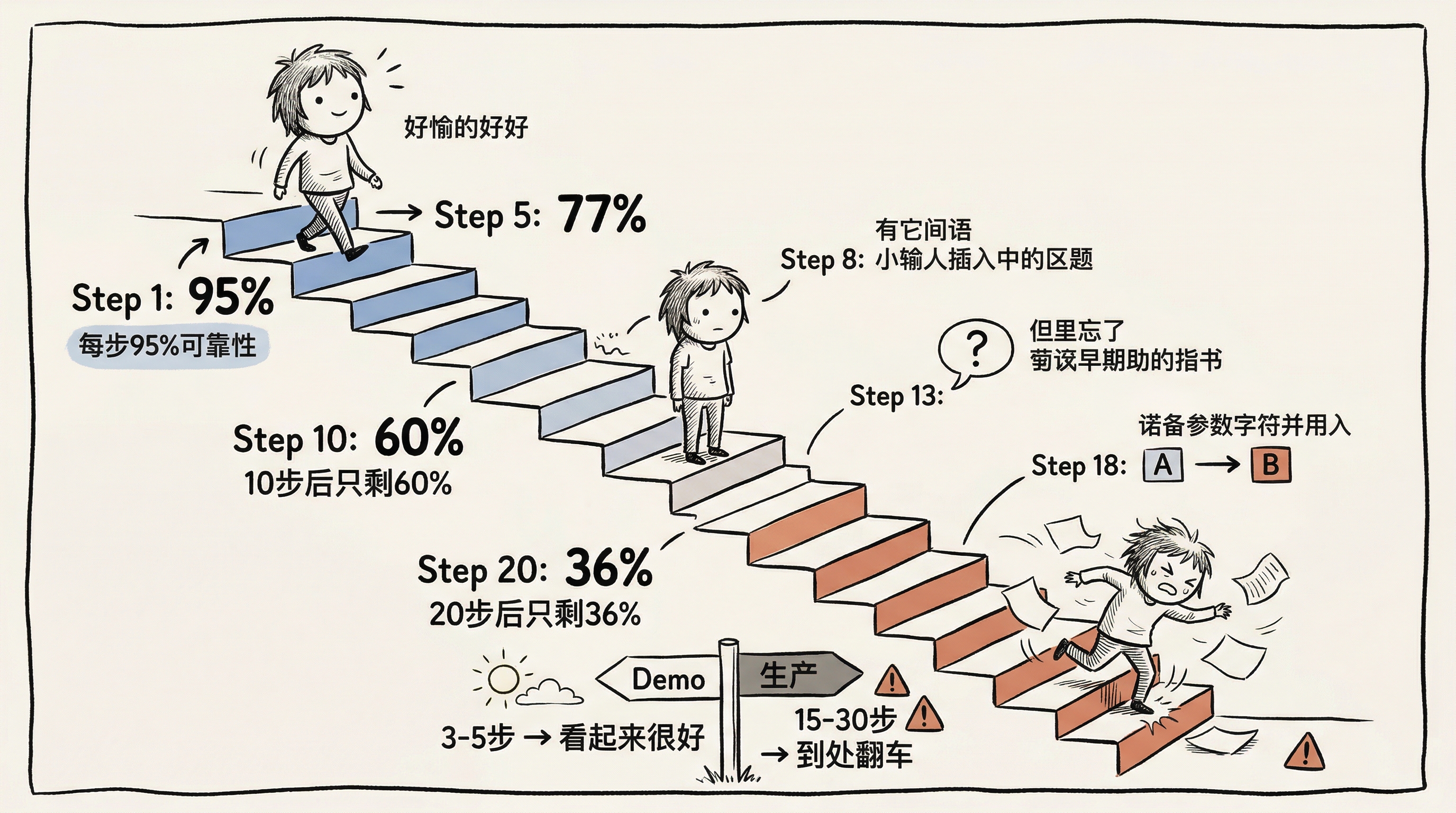 Agent 的每一步可靠性假设 95%——已经相当好了。10 步下来,端到端只剩 60%。20 步剩 36%。