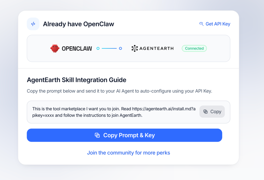 他们提供的使用方式非常简单。对于 OpenClaw 这类 AI agent,理想状态是通过一次安装 AgentEarth 的 API,就能调用各类外部高质量服务,不再需要注册和申请 API Key 了。之后的访问也不再需要人类参与,AI agent 可以自主完成所有操作。根据他们的产品文档,用户只需要一句话告诉 OpenClaw 助手需要什么技能,AgentEarth 会自动帮你搜索、筛选、一键安装,全程无需手动操作。