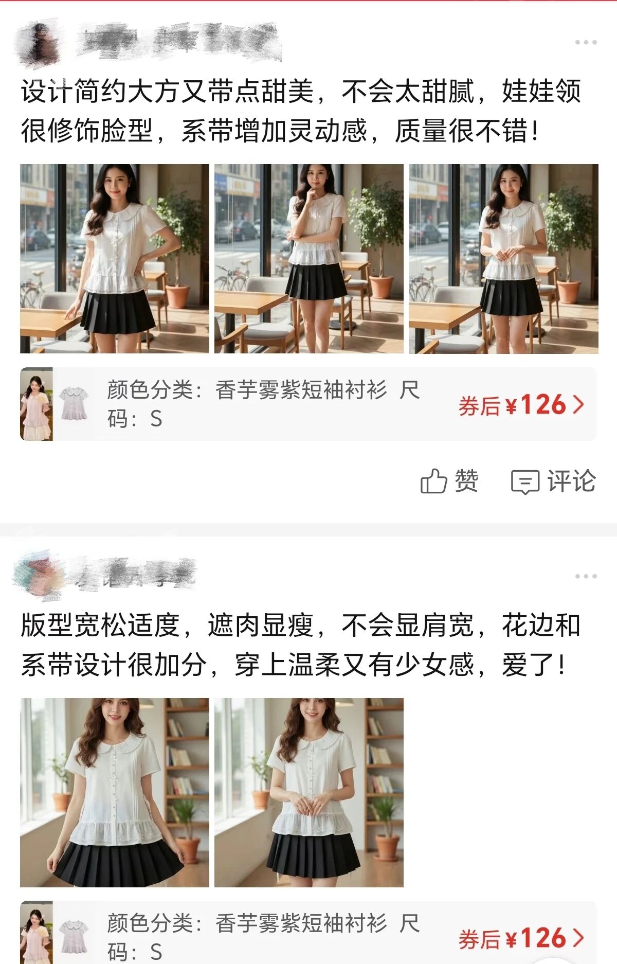 没想到,过几天她再看商品评价区时,发现一位买家发布的带图评价,不仅上衣、身材和自己高度相似,就连拖鞋、手机壳都一模一样。